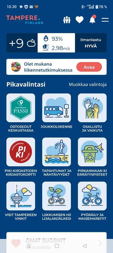 Tampere.Finland-sovelluksesta löytyvä liikkumisen hiilijalanjälkilaskuri kannustaa tamperelaisia vihreämpään liikkumiseen. Laskurista selviää esimerkiksi oma yleisin kulkumuoto ja kuukausittainen liikkumisen hiilijalanjälki.